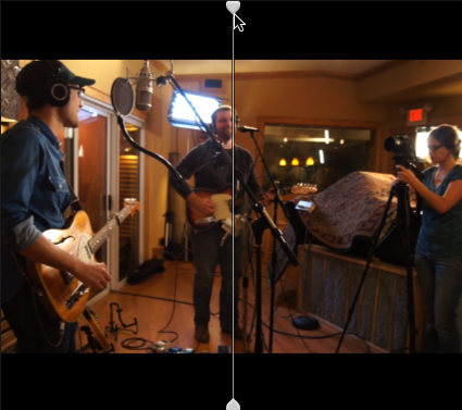 Teilen: Ein einzelner Frame wird auf geteiltem Bildschirm mit dem ursprünglichen Video auf der linken und dem farbkorrigierten Video auf der rechten Seite angezeigt.Wenn Sie die Teilungsposition verschieben möchten, zeigen Sie auf das Vorschaubild. Wenn der Teilungspunkt angezeigt wird, können Sie mit den Griffen am oberen Bildschirmrand anpassen, wo die Vorschau geteilt wird: