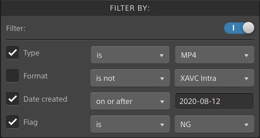 種類フォーマットフラグ フィルタ項目では、一致するファイルをメディア ブラウザに表示するか表示しないかを [である] あるいは [ではない] で選択できます。