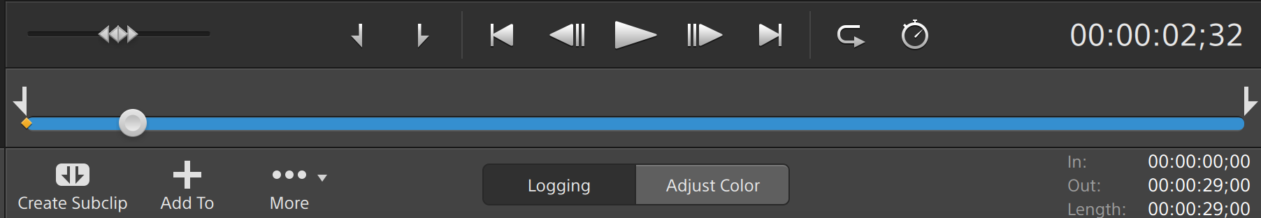 再生位置インジケータがマーク イン位置に移動します。もう一度クリックすると、選択したファイルの最初に移動します。 |
