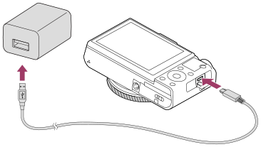 Fotoaparatą, kuriame įdėta maitinimo elementų pakuotė, naudodami USB mikrokabelį (pridedamas) prijunkite prie kintamosios srovės adapterio (pridedamas), o kintamosios srovės adapterį prijunkite prie sieninio elektros lizdo.