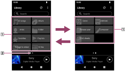 [Music player] elemet a könyvtár képernyő megjelenítéséhez. - Érintse meg a kívánt kategóriát (