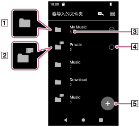 您最多可以将播放器内部存储器或microSD卡上的10个文件夹注册到[要导入的文件夹]。存储在[要导入的文件夹]中的音乐文件将被导入到“音乐播放器”的数据库中,您可以用与默认文件夹中保存的音乐文件一样的方式来播放或管理这些文件。