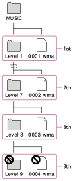 Плейърът може да възпроизвежда музикални файлове, съхранени от първо до осмо ниво на всяка папка.