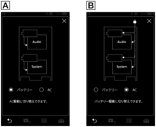 - [バッテリー]または[AC]を選ぶ。