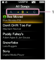 I registeret vises en liste over sanger eller navn på album, under hver enkelt bokstav i alfabetet. Naviger i registeret ved å trykke på (