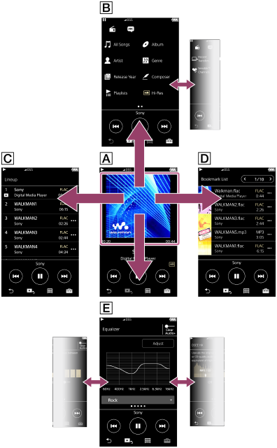 Táto téma vysvetľuje rozloženie rôznych obrazoviek s obrazovkou prehrávania (