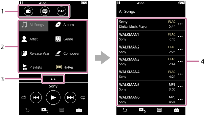 Varat atlasīt ierakstus bibliotēkas ekrānā. Ieraksti tiek klasificēti dažādās kategorijās (piemēram, [All Songs], [Album], [Artist] utt.).