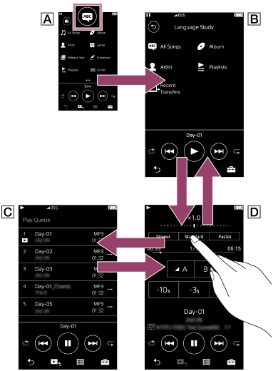 Valodas apguves funkcijas ekrāna izkārtojums ir parādīts nākamajās ilustrācijās Pavelciet, lai pārvietotos pa ekrāniem.
