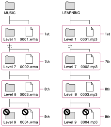 Myšou presuňte obsah do správneho priečinka tak, ako je to znázornené na nasledujúcej ilustrácii. Prehrávač Walkman dokáže prehrávať obsah uložený na prvej až ôsmej úrovni každého priečinka.