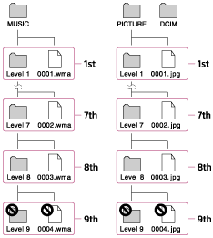 Povlecite in spustite vsebine, kot so glasba ali mape, v ustrezno mapo, kot je prikazano na naslednjih slikah. Predvajalnik Walkman lahko predvaja vsebino, shranjeno od 1. do 8. ravni vsake mape.