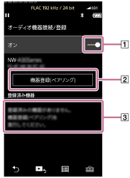 –[設定]–[Bluetooth]の[オーディオ機器接続/登録]をタップする。Bluetooth接続画面が表示されます。 - Bluetooth スイッチ(