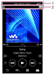 Du kan kontrollere avspillingsstatusen og ulike innstillinger ved hjelp av ikonene som vises i informasjonsområdet. Ikonene varierer avhengig av statusen til Walkman.