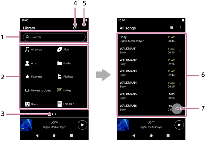 Pode selecionar faixas a partir do ecrã da biblioteca. As faixas são classificadas em várias categorias (como [Todas as músicas], [Álbum], [Artista], etc.).