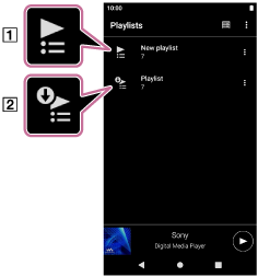No ecrã da biblioteca no “Leitor de música”, toque em [Listas de reprodução] para ver a lista de listas de reprodução.
