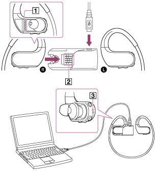 - 起動しているパソコンにウォークマンを接続する。充電中は右(