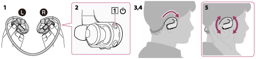 )を約3秒長押しし、ウォークマンの電源を入れる。 - ネックバンドを耳と頭の間に上からかける。
