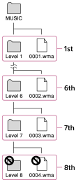 Μεταφέρετε και αποθέστε το περιεχόμενο στον σωστό φάκελο, όπως φαίνεται στην παρακάτω εικόνα. Το Walkman να αναπαράγει περιεχόμενο αποθηκευμένο στο πρώτο έως και το έβδομο επίπεδο κάθε φακέλου.