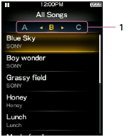 Rejstřík zobrazuje seznam názvů skladeb nebo alb společně s písmeny abecedy. Rejstřík můžete procházet tisknutím tlačítek