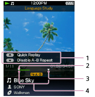 Puede establecer un fragmento específico (del punto A al punto B) en un archivo de audio y reproducir ese fragmento varias veces mientras utiliza la función de estudio de idiomas (repetición A-B).