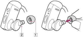 将耳塞压到耳机上,直到耳塞带颜色部分的端部()与对齐为止。请将耳塞牢固安装于耳机上,以防耳塞脱落和遗留在耳朵中。