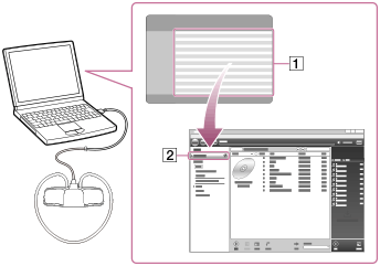 3. 从iTunes中选择想要的内容(),并将其拖放到“Walkman(型号名称)”中()。