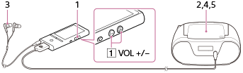 オーディオ機器のヘッドホン端子と接続している場合は、オーディオ機器の音量を、音がひずまない程度に大きめに調整する。