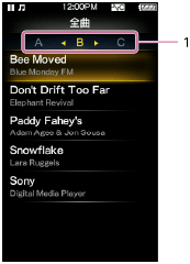 曲やアルバム、アーティスト名を、50音順やアルファベット順で頭文字を選んで、一覧画面の先頭に表示します。インデックスが表示されているときは、ボタン()でカーソルを移動できます。