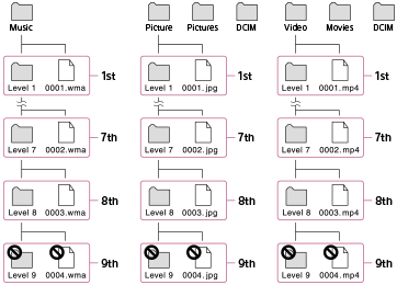 Træk og slip indhold som f.eks. musik eller mapper til den korrekte mappe, som vist på de følgende illustrationer. Din Walkman kan afspille indhold lagret på det 1. til det 8. niveau i hver mappe.