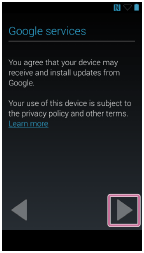 Uma tela para configurações iniciais é exibida na primeira vez em que o Walkman é ligado. Esta explicação parte do princípio de que as configurações de conexões Wi-Fi e de contas do Google são saltadas inicialmente e definidas conforme o necessário posteriormente.