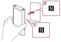 Jei išmanusis telefonas palaiko NFC funkciją, galite lengvai prijungti „Walkman“ prie telefono. Galite sujungti prietaisus ir įjungti „Bluetooth“ ryšį paprasčiausiai prilietę „Walkman“ prietaisą išmaniuoju telefonu.