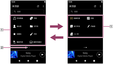 存储在播放器上的内容可能不会出现在“音乐播放器”的库中。在这种情况下,请确保音乐文件位于播放器内存中的[Music]文件夹或[Download]文件夹中,或位于microSD卡上的[Music]文件夹中。另外,点按