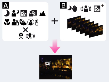 Kameraet tar seriebilder ved behov og legger dem over hverandre. Ved å legge bilder over hverandre, lagrer kameraet et bilde med mindre uskarphet og støy.