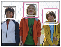 - Jos eri kasvojen ensisijaisuusjärjestys on rekisteröity [Kasvojen rekister.] -toiminnolla, tuote valitsee automaattisesti ensimmäiseksi asetetut kasvot, joiden päällä oleva kasvontunnistuskehys muuttuu valkoiseksi. Muiden rekisteröityjen kasvojen kasvontunnistuskehykset muuttuvat punertavan purppuranvärisiksi.