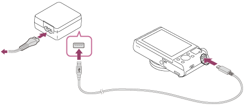 - Pripojte fotoaparát s akumulátorom vloženým do sieťového adaptéra (je súčasťou dodávky) pomocou mikro USB kábla (je súčasťou dodávky) a potom pripojte sieťový adaptér k elektrickej zásuvke.