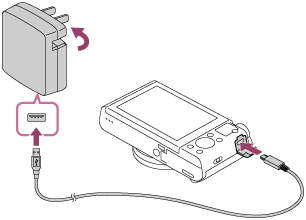 - Koble kameraet, med innsatt batteri, til vekselstrømadapteren (inkludert) ved hjelp av mikro-USB-kabelen (inkludert), og koble vekselstrømadapteren til stikkontakten.