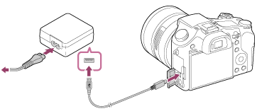 - Tilslut kameraet til det batteri, som er sat ind i lysnetadapteren (medfølger), vha. mikro-USB-kablet (medfølger) og tilslut lysnetadapteren til stikkontakten.