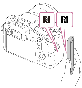 - ألصق الهاتف الذكي بالمنتج لمدة ثانية أو ثانيتين حتى يبدأ PlayMemories Mobile في العمل.