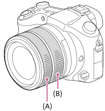 Обертаючи переднє кільце об'єктива (A) та заднє кільце об'єктива (B) можна використовувати функції масштабування і фокусування більш інтуїтивно. Також функції масштабування і фокусування можна призначити передньому або задньому кільцю об'єктива за допомогою [Налаш.кільця об'єк.].