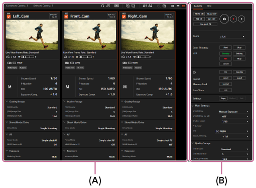 Z poziomu karty „Camera” można wykonywać operacje w odniesieniu do aparatów zaznaczonych w obszarze informacji o aparatach, na przykład rejestrować obrazy lub zmieniać ustawienia.