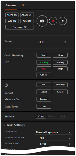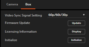 您可以使用“Box”標籤來設定同步訊號、更新軟體,或初始化所有已連接的相機控制盒。