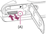 Avaa muistikortin kansi, varmista, ettei käytön merkkivalo (A) pala, ja poista muistikortti painamalla sitä kevyesti sisään kerran.