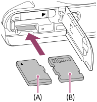 Memory Stick Micro: Aseta kortti liitinpuoli kohti kameran objektiivin puolta kuvan mukaisesti (B).