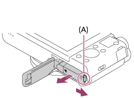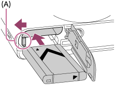 Pass på at tilgangslampen ikke lyser, og slå av kameraet. Skyv så låsehendelen (A) til side og ta ut batteriet. Vær forsiktig så du ikke mister batteriet.