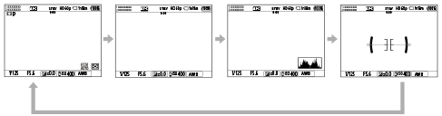 Pritiskom na gumb DISP (Postavka prikaza) možete promijeniti prikazani sadržaj na zaslonu tijekom snimanja i reprodukcije. Zaslon se mijenja svaki put kad pritisnete gumb DISP. Prikazi za snimanje na tražilu i monitoru mogu se zasebno postaviti.