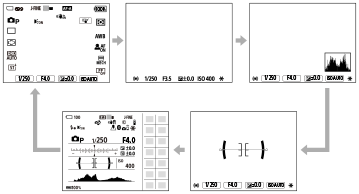Со притискање на копчето DISP (Поставки за приказ), можете да ја промените содржината што се прикажува на екранот за време на снимањето и репродукцијата. Екранот се менува со секое притискање на копчето DISP. Приказот на визирот и приказот на екранот за фотографирање може да се постават посебно.
