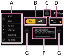 F. التردد الحالي، اسم برنامج الخدمة*، مؤشر RDS (نظام البيانات الإذاعية)**متوفر فقط أثناء استقبال RDS.