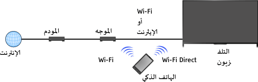 (عند استخدام جهاز التحكم عن بعد بلوحة اللمس، اضغط على لوحة اللمس، ثم اضغط على لوحة اللمس مرة أخرى للانتقال إلى «الاتصال بالإنترنت» لمعرفة التفاصيل).قم بتوصيل الجهاز المحمول بالشبكة المنزلية المتصل بها التلفزيون.