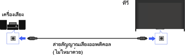 เชื่อมต่อชุดเครื่องเสียง (เช่น ชุดโฮมเธียเตอร์) ที่มีช่องรับสัญญาณเข้าแบบดิจิตอลเข้ากับทีวี โดยใช้สายสัญญาณเสียงออพติคอล