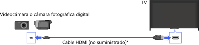 Conecte su cámara fotográfica digital o videocámara Sony con un cable HDMI. Use un cable que tenga una toma mini HDMI para la cámara fotográfica digital o videocámara, y una toma HDMI estándar para el TV.