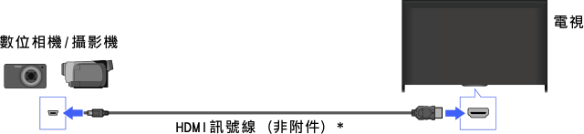 使用HDMI訊號線連接Sony數位相機或攝影機。將具有HDMI迷你插孔(插座)的訊號線連接數位相機/攝影機端,並將標準HDMI插孔(插座)連接電視機端。